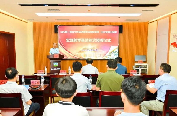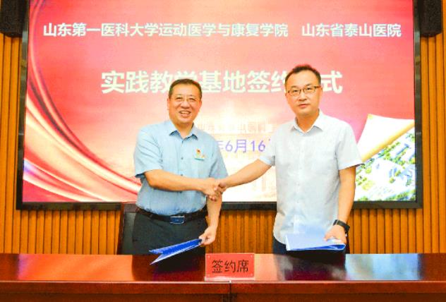6月16日下午,山东省泰山医院、山东第一医科大学运动医学与康复学院实践教学基地签约授牌仪式隆重举行。山东省泰山医院党委书记毛军胜、党委副书记贺伟,山东第一医科大学运动医学与康复学院院长贾庆卫、副院长纪龙,以及双方部分相关科室负责人出席了此次签约仪式。签约仪式由贺伟主持。