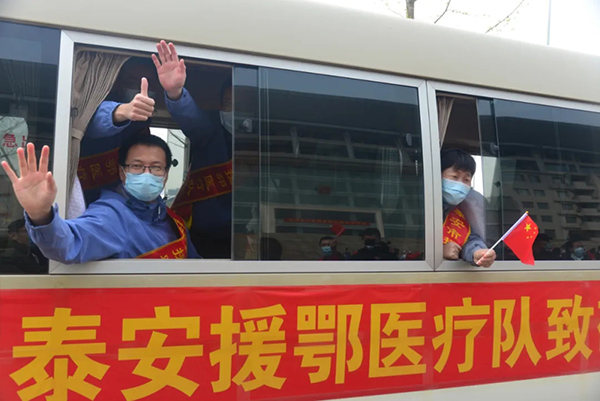 4月5日上åˆï¼Œå±±ä¸œçœæ³°å±±ç–—å…»é™¢ï¼ˆå±±ä¸œçœæ³°å±±åŒ»é™¢ï¼‰4åæ”¯æ´æ¹–北医疗队员乘å大巴车到市政大楼楼å‰å¹¿åœºå‚åŠ æ³°å®‰å¸‚ä¸¾åŠžçš„ç¬¬äºŒæ‰¹è¿”æ³°é˜Ÿå‘˜å‡¯æ—‹æ¬¢è¿Žä»ªå¼ã€‚