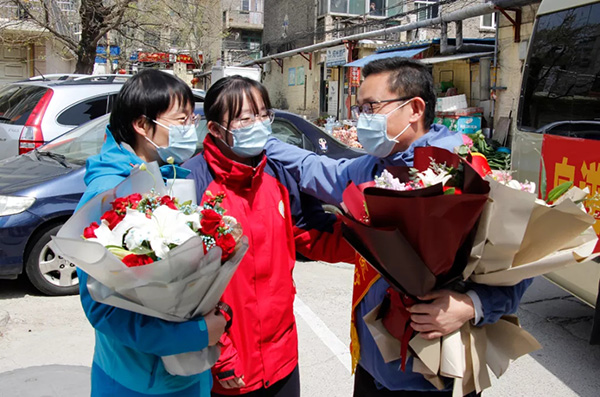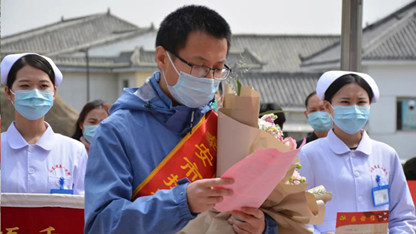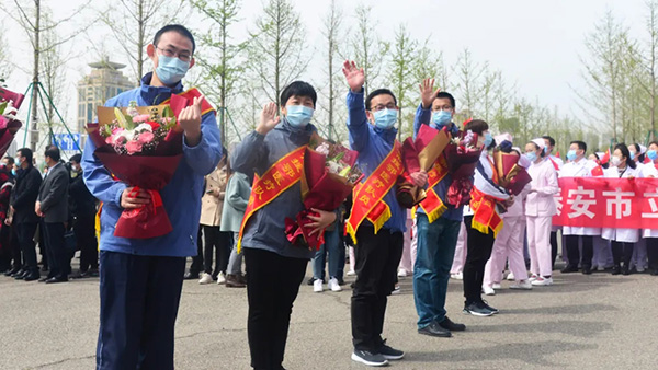 4月5æ—¥ï¼Œå±±ä¸œçœæ³°å±±ç–—å…»é™¢ï¼ˆå±±ä¸œçœæ³°å±±åŒ»é™¢ï¼‰æ”¯æ´æ¹–北四å医疗队员高磊ã€åºžæ€€åˆšã€åŸæ™“åŽã€å°¹å¼˜ä¼Ÿå¹³å®‰å‡¯æ—‹ã€‚åŽ»æ—¶ï¼Œé£Žé›¨å…¼ç¨‹ï¼Œæ— æ‰€ç•æƒ§ï¼›å½’æ¥ï¼Œä¸è´Ÿé‡æ‰˜ï¼Œä¸è¾±ä½¿å‘½ã€‚全院干部èŒå·¥ä»¥æœ€éš†é‡çš„ä»ªå¼æŽ¥è‹±é›„å›žå®¶ï¼