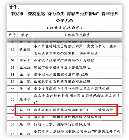 è¿‘æ—¥ï¼Œå¸‚å§”å®£ä¼ éƒ¨ã€å›¢å¸‚å§”ã€å¸‚工业推进办ã€å¸‚呿”¹å§”ã€å¸‚生æ€çŽ¯å¢ƒå±€ã€å¸‚农业农æ‘å±€ã€å¸‚文旅局ã€å¸‚é’è”å…±åŒå¼€å±•泰安市“登高望远 奋力争先 é’æ˜¥å½“å…ˆ 开新局â€é’å¹´æ ‡å…µé€‰æ ‘æ´»åŠ¨ï¼Œå¯¹è¯„å‡ºçš„60åé’å¹´æ ‡å…µè¿›è¡Œäº†å…¬å¸ƒï¼Œå±±ä¸œçœæ³°å±±åŒ»é™¢ä¸´åºŠè¥å…»ç§‘副主任赵娟åŒå¿—è£èŽ·è£èª‰ç§°å·ã€‚